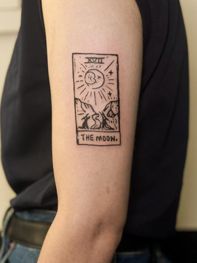 Ik heb ook eindelijk een tweede tattoo laten zetten. Omdat ik uiteindelijk dus toch niet op buitenlandstage ging, wilde ik ergens anders mijn geld impulsief aan uitgeven. Ik zag dat een artiest die ik volgde op Instagram (@wishmoons) nieuwe flashtattoos had gepost en een daarvan vond ik heel mooi én had ook nog een betekenis die bij mij paste. Zo gezegd zo gedaan en twee weken daarna lag ik op de stoel terwijl er herhaaldelijk een naald in mijn arm ging. Het is een tarotkaart van de maan; het staat voor angsten die je tegenhouden en die je probeert te overwinnen. Ook staat het symbool voor het volgen van je intuïtie en dat de werkelijkheid vaak minder eng is dan je verbeelding.